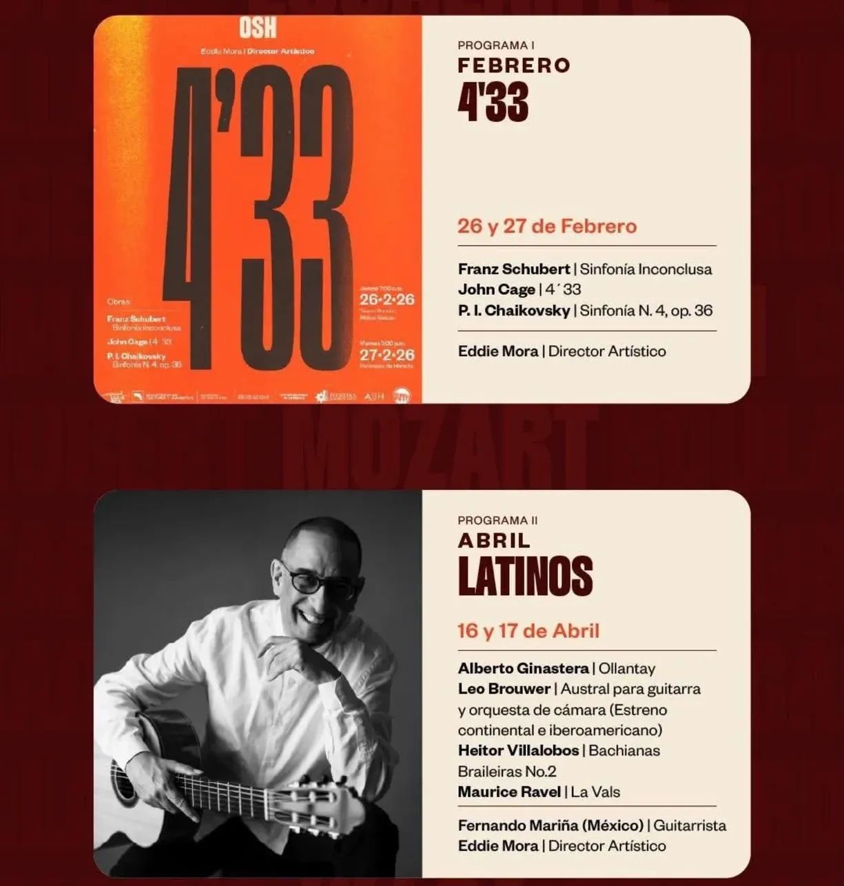 Muy honrado de participar en el Programa II de la Temporada 2026 de la Orquesta Sinfónica de Heredia, al lado de su Director Artístico, Maestro Eddie Mora Bermúdez. Estaremos haciendo el estreno en América e Iberoamerica de Austral, para guitarra y orquesta de cámara del Maestro Leo Brouwer, para posteriormente grabarlo. Feliz y agradecido de regresar a Costa Rica para hacer música al lado de nuevos amigos, de la mano de viejos amigos...